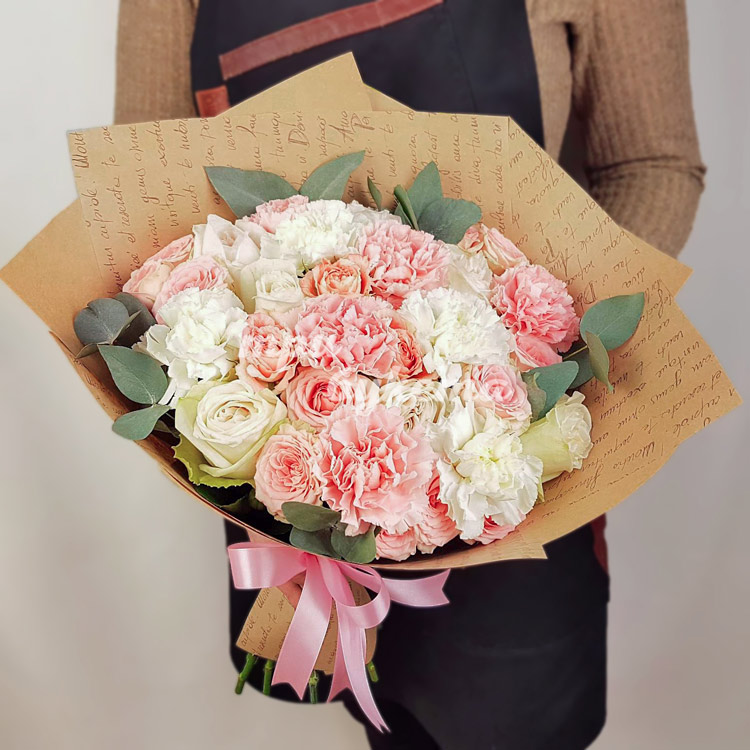 Белые и розовые гвоздики и розы