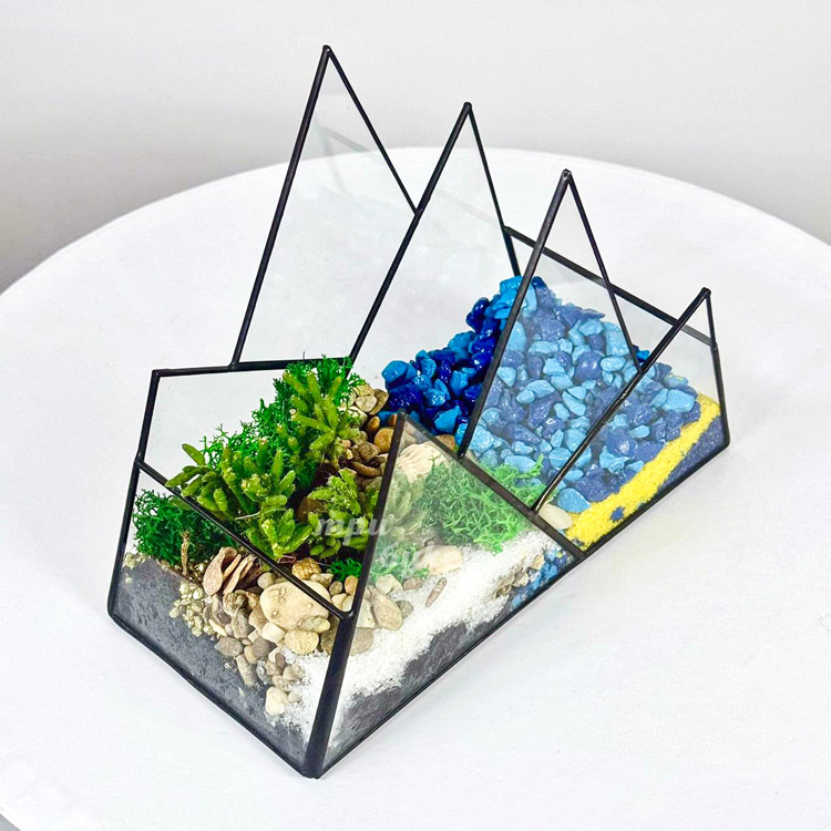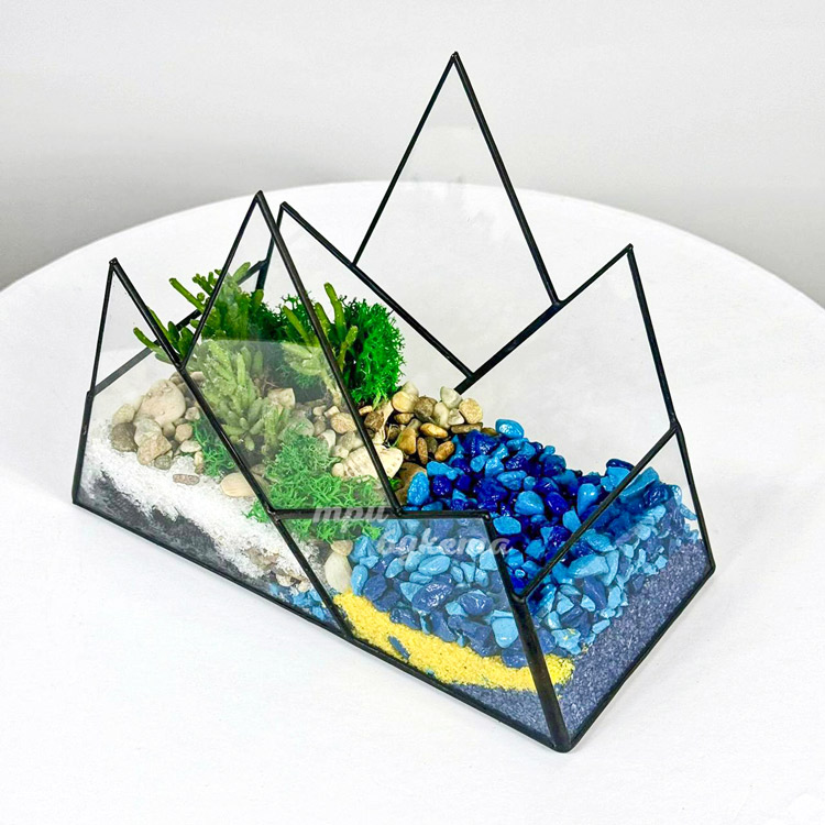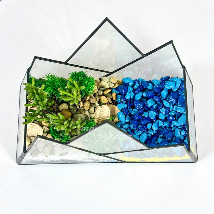 Флорариум с синими камешками, мхом и суккулентом