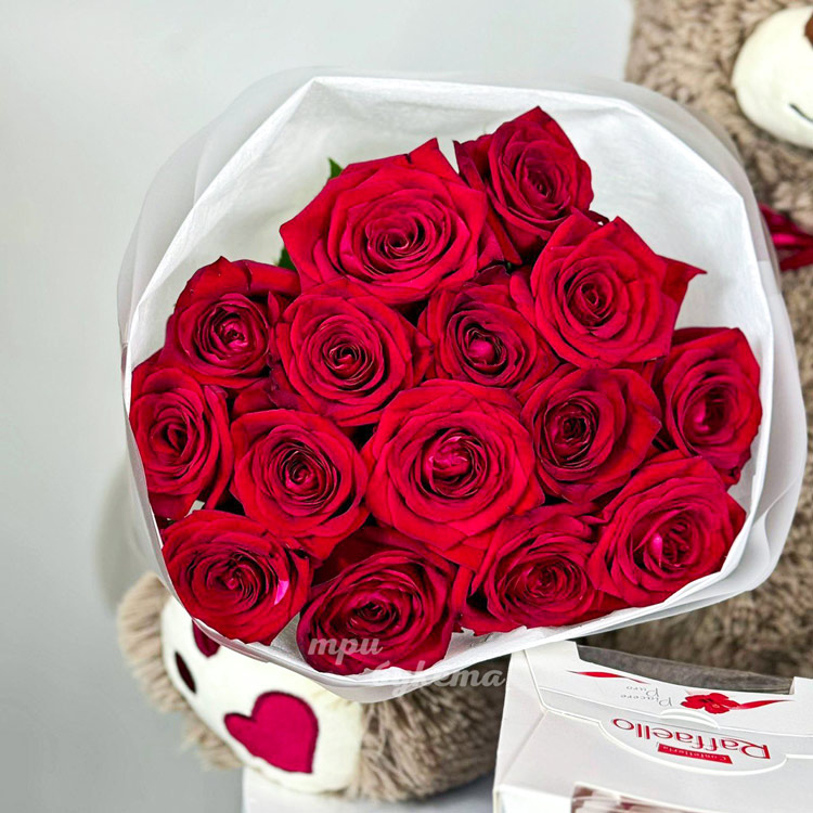 Набор из мягкой игрушки, шариков, конфет и 15 красных роз