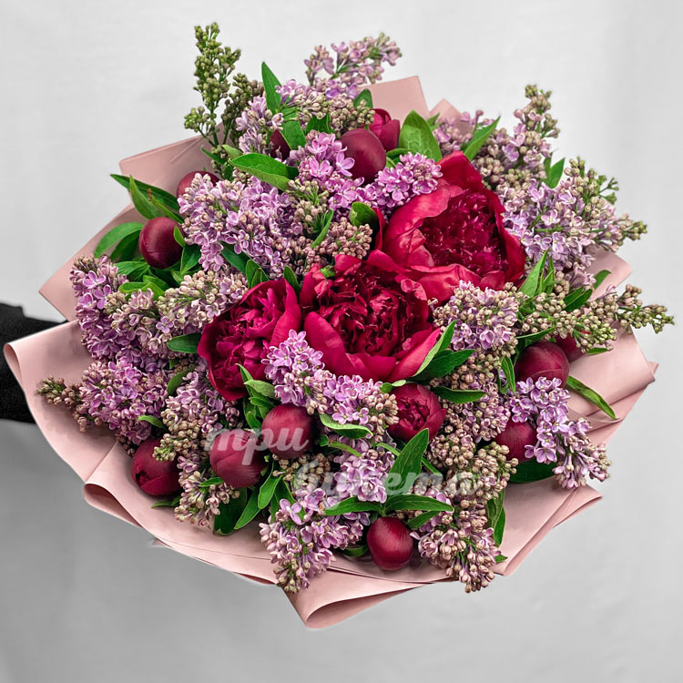 Пышный букет красных пионов и сирени