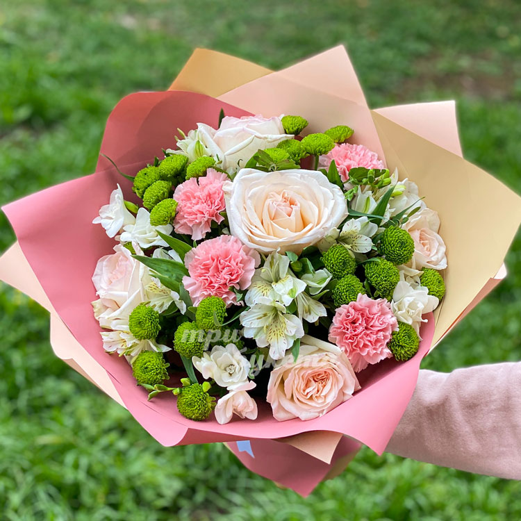 Розовые гвоздики и белые розы