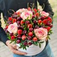 Розовый букет из гортензии, гвоздик и роз